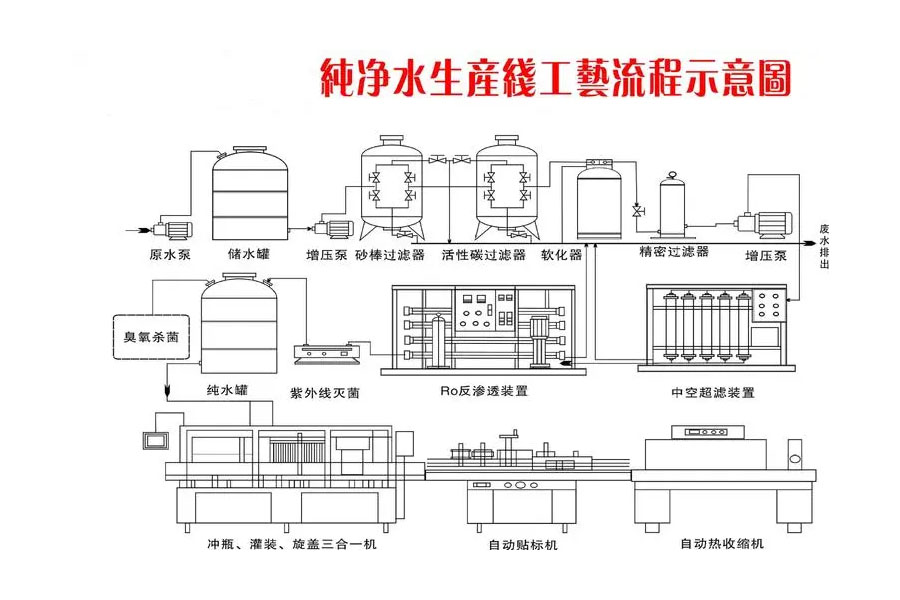 一套完整的纯净水生产线设备,一般包括以下几个部分:
